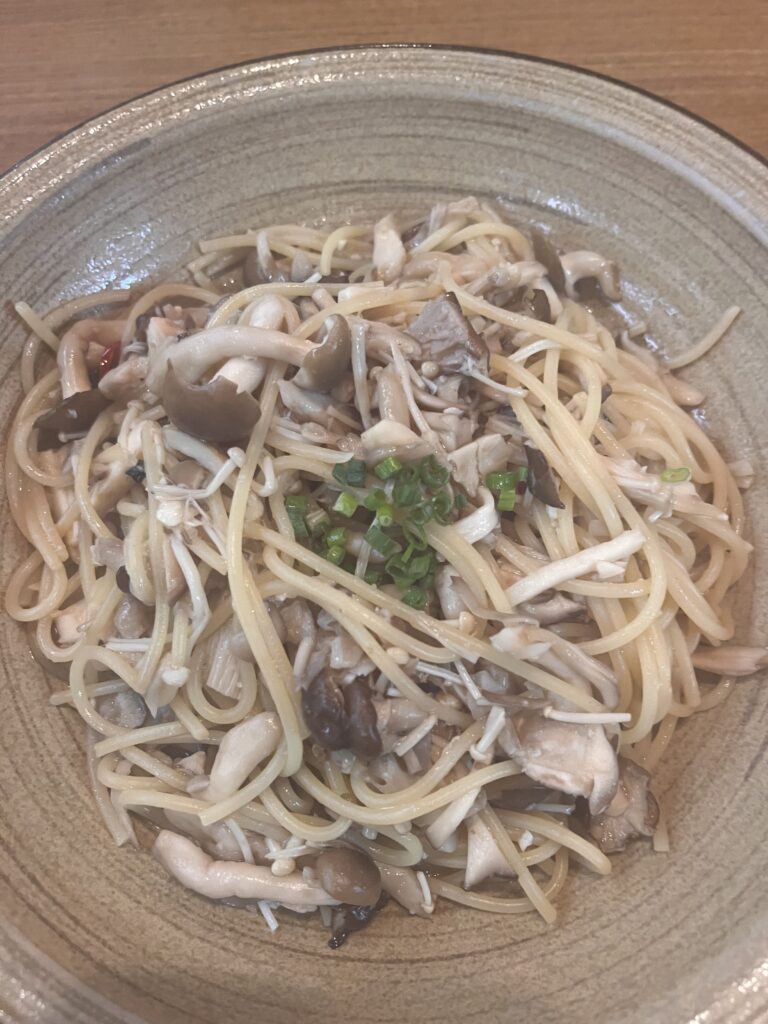 レーと入った店で食べたパスタペペロンチーノです、きのこ多めでした。美味しかったけど結構きのこ味で途中からきつかったです。