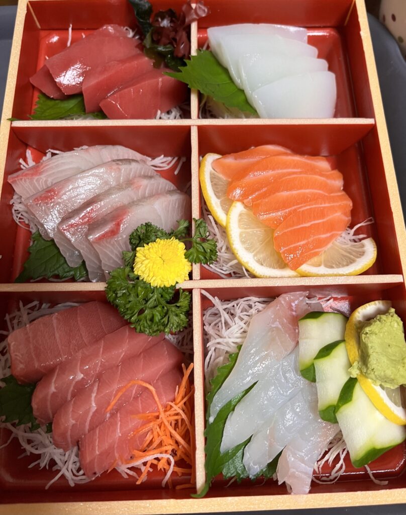 漁港の市場で食べれる刺身ぐらい分厚くて、脂のってて白身もイカもサーモンも全部完璧に美味かった。食べる前に戻って、また1から食べたいでしかない。